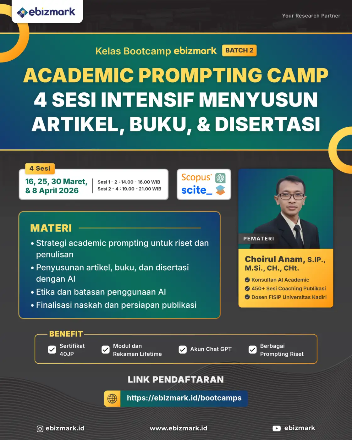 Kesulitan untuk publish di jurnal bereputasi? Kemampuan menulis penelitian masih biasa saja? Olah data tidak mampu? Semua pertanyaan Anda akan terbantu oleh Bootcamp Ebizmark. Bootcamp merupakan pelatihan daring secara synchronous asynchronous selama 5 Minggu. Program ini disusun secara struktur dari fundamental sampai hingga tinggi sesuai dengan trend terkini. Bootcamp intensif Ebizmark mendatangkan ahli expert nomor 1 di bidangnya.