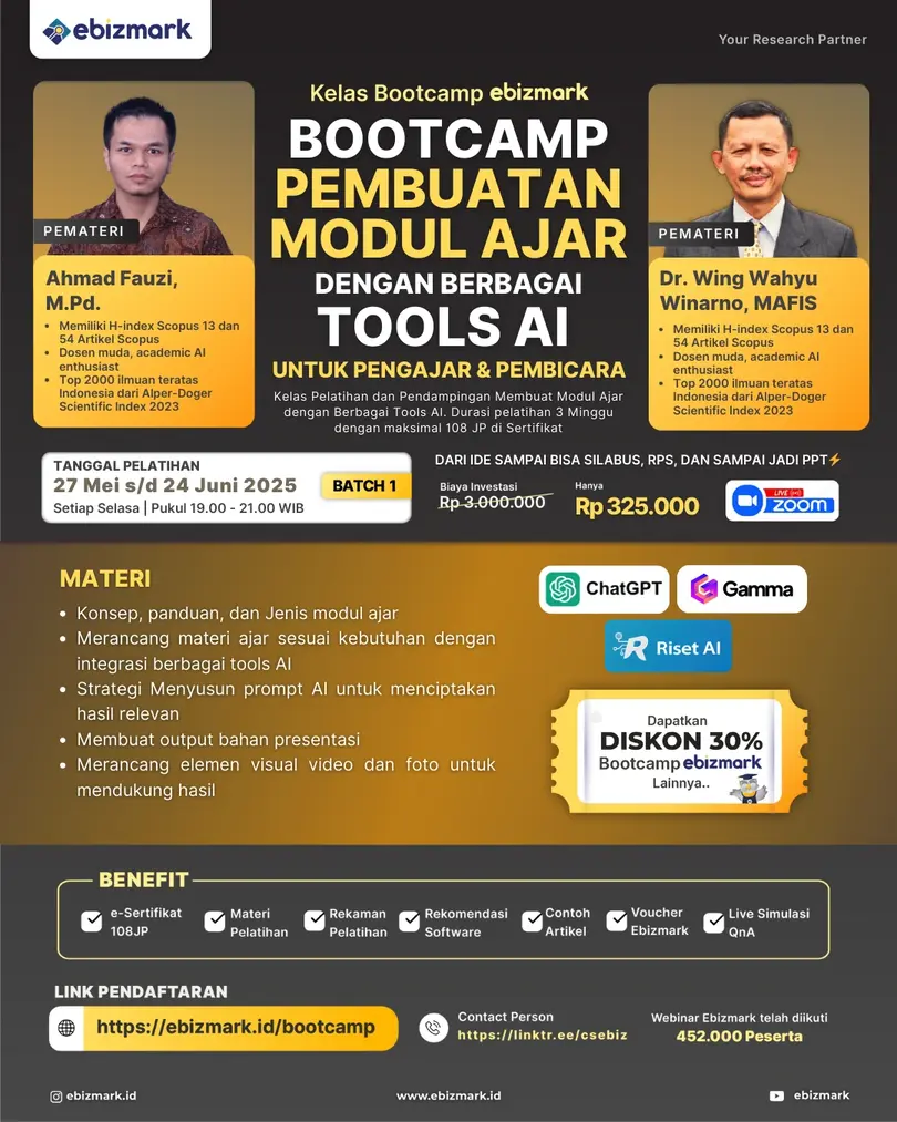Kesulitan untuk publish di jurnal bereputasi? Kemampuan menulis penelitian masih biasa saja? Olah data tidak mampu? Semua pertanyaan Anda akan terbantu oleh Bootcamp Ebizmark. Bootcamp merupakan pelatihan daring secara synchronous asynchronous selama 5 Minggu. Program ini disusun secara struktur dari fundamental sampai hingga tinggi sesuai dengan trend terkini. Bootcamp intensif Ebizmark mendatangkan ahli expert nomor 1 di bidangnya.