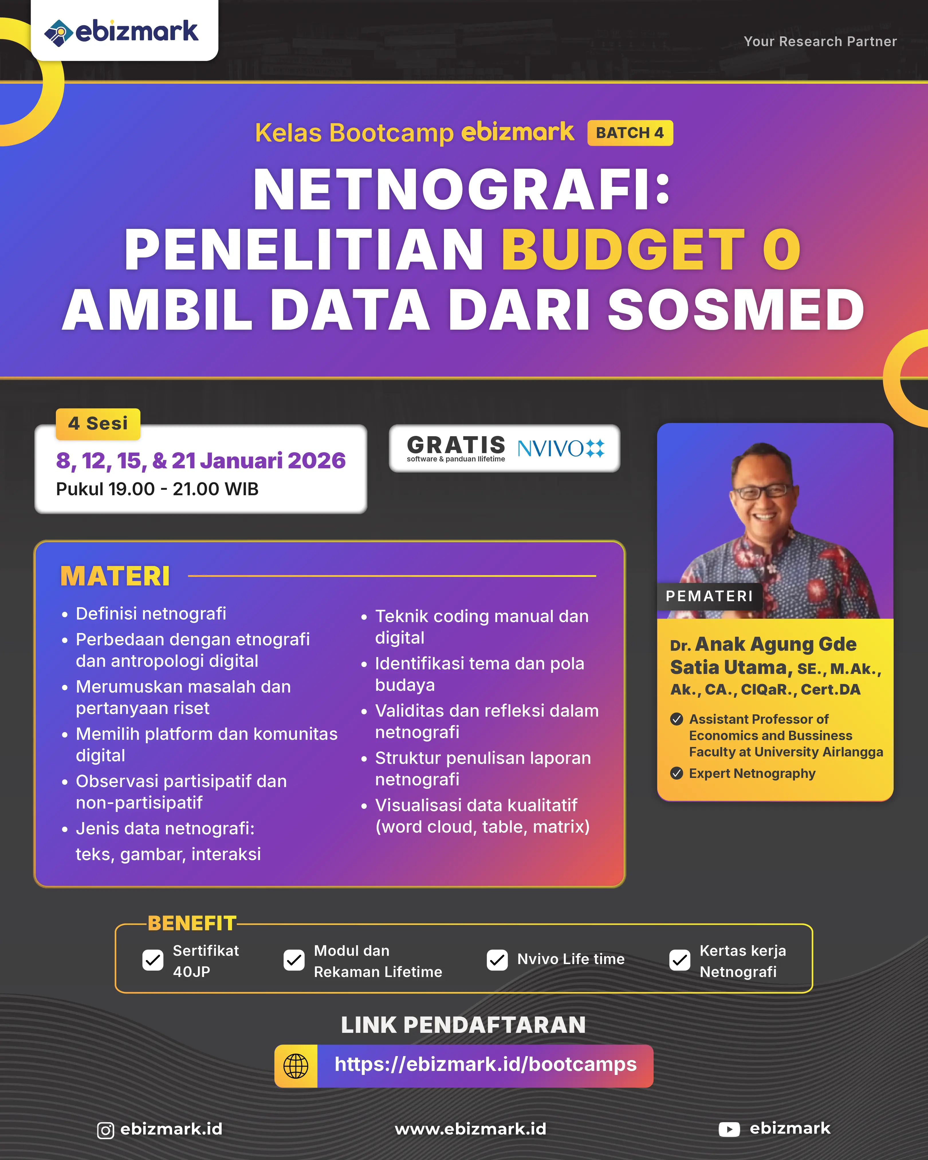 Kesulitan untuk publish di jurnal bereputasi? Kemampuan menulis penelitian masih biasa saja? Olah data tidak mampu? Semua pertanyaan Anda akan terbantu oleh Bootcamp Ebizmark. Bootcamp merupakan pelatihan daring secara synchronous asynchronous selama 5 Minggu. Program ini disusun secara struktur dari fundamental sampai hingga tinggi sesuai dengan trend terkini. Bootcamp intensif Ebizmark mendatangkan ahli expert nomor 1 di bidangnya.