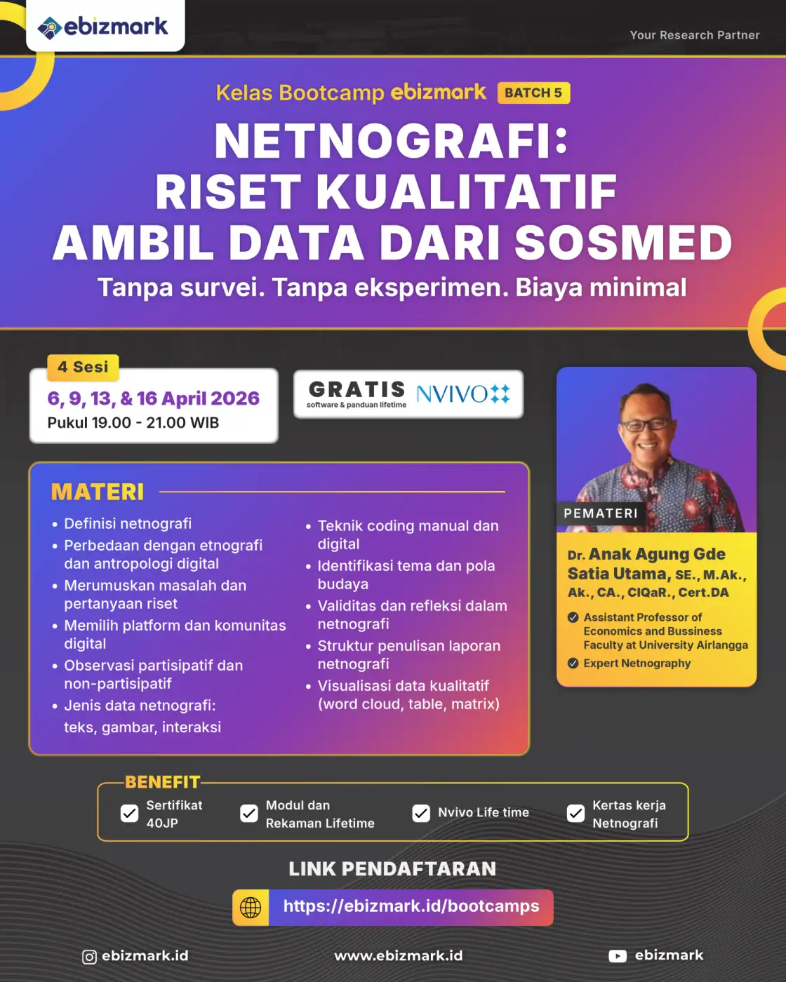 Kesulitan untuk publish di jurnal bereputasi? Kemampuan menulis penelitian masih biasa saja? Olah data tidak mampu? Semua pertanyaan Anda akan terbantu oleh Bootcamp Ebizmark. Bootcamp merupakan pelatihan daring secara synchronous asynchronous selama 5 Minggu. Program ini disusun secara struktur dari fundamental sampai hingga tinggi sesuai dengan trend terkini. Bootcamp intensif Ebizmark mendatangkan ahli expert nomor 1 di bidangnya.