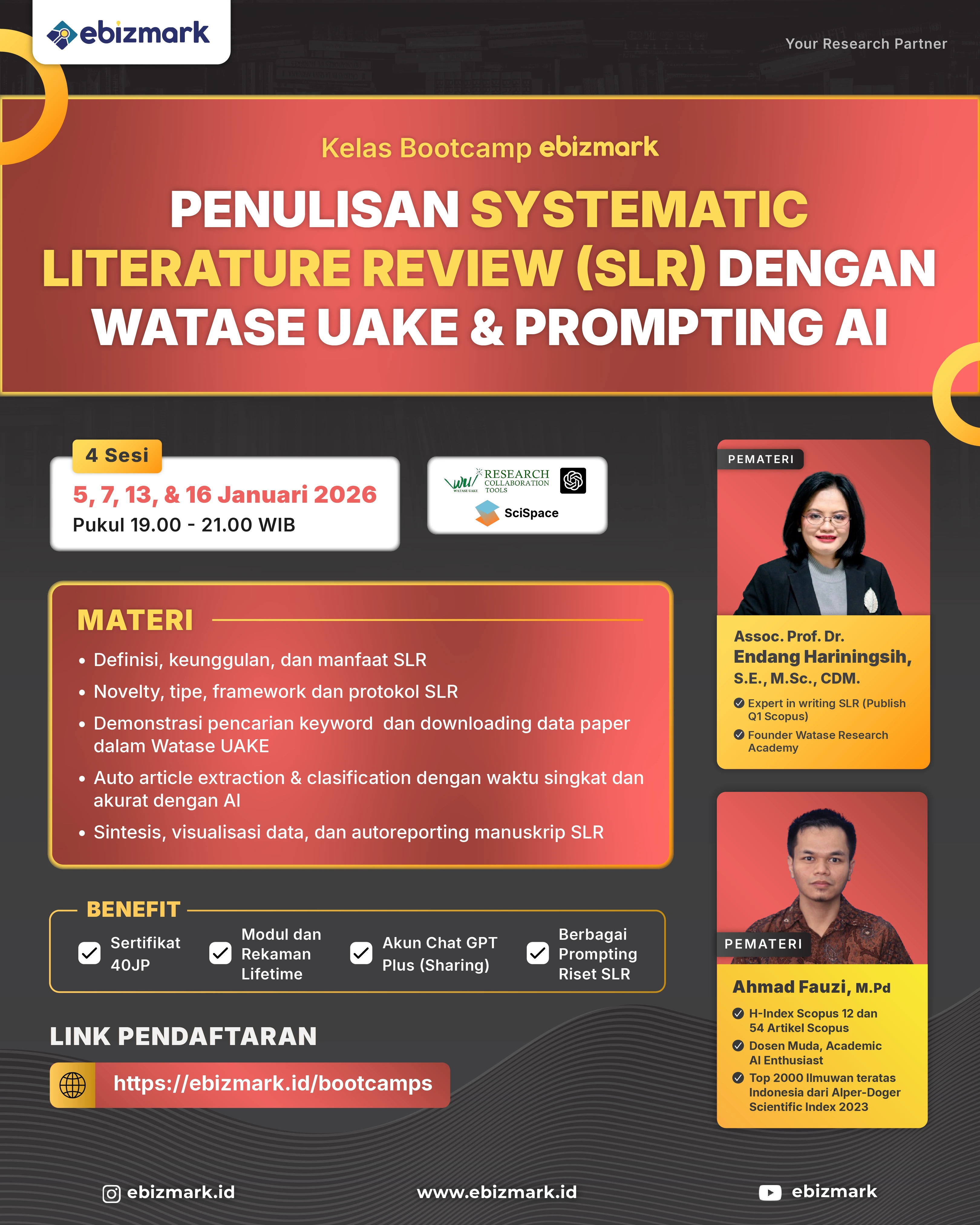 Kesulitan untuk publish di jurnal bereputasi? Kemampuan menulis penelitian masih biasa saja? Olah data tidak mampu? Semua pertanyaan Anda akan terbantu oleh Bootcamp Ebizmark. Bootcamp merupakan pelatihan daring secara synchronous asynchronous selama 5 Minggu. Program ini disusun secara struktur dari fundamental sampai hingga tinggi sesuai dengan trend terkini. Bootcamp intensif Ebizmark mendatangkan ahli expert nomor 1 di bidangnya.
