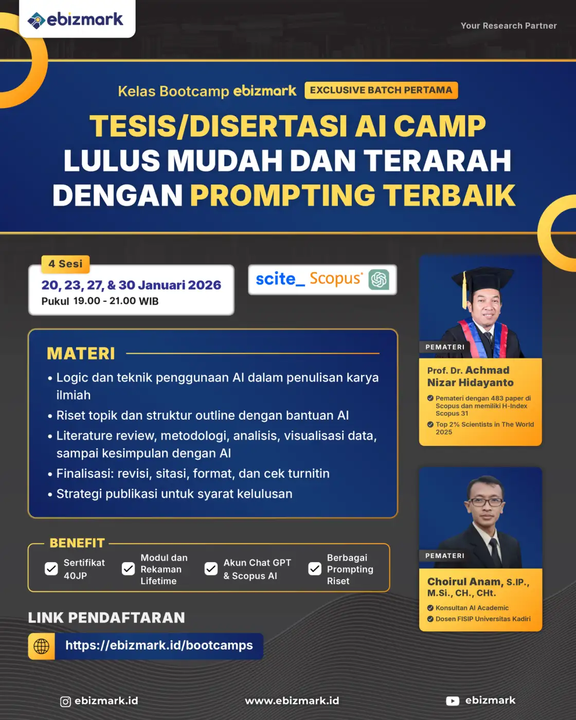 Kesulitan untuk publish di jurnal bereputasi? Kemampuan menulis penelitian masih biasa saja? Olah data tidak mampu? Semua pertanyaan Anda akan terbantu oleh Bootcamp Ebizmark. Bootcamp merupakan pelatihan daring secara synchronous asynchronous selama 5 Minggu. Program ini disusun secara struktur dari fundamental sampai hingga tinggi sesuai dengan trend terkini. Bootcamp intensif Ebizmark mendatangkan ahli expert nomor 1 di bidangnya.