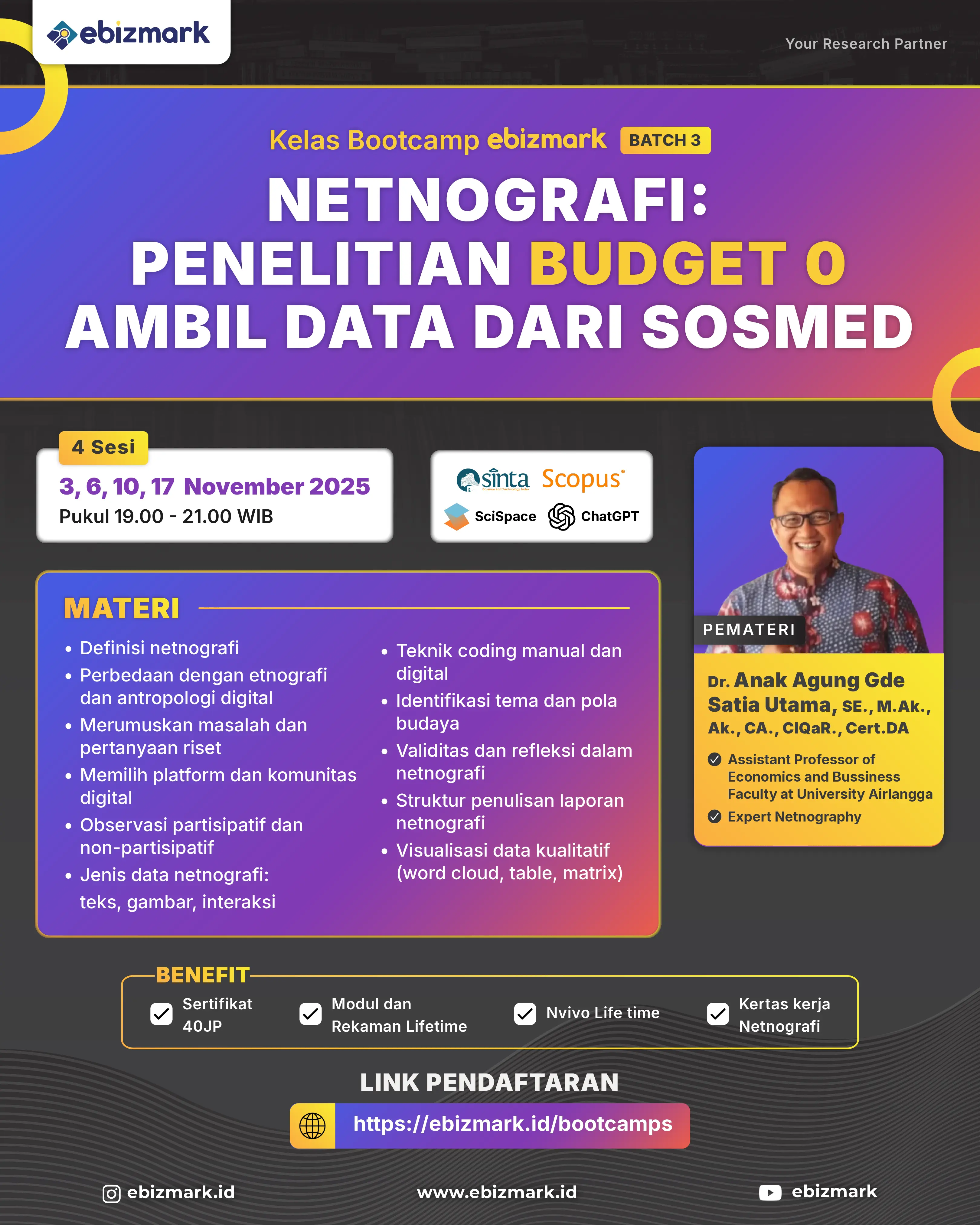 Kesulitan untuk publish di jurnal bereputasi? Kemampuan menulis penelitian masih biasa saja? Olah data tidak mampu? Semua pertanyaan Anda akan terbantu oleh Bootcamp Ebizmark. Bootcamp merupakan pelatihan daring secara synchronous asynchronous selama 5 Minggu. Program ini disusun secara struktur dari fundamental sampai hingga tinggi sesuai dengan trend terkini. Bootcamp intensif Ebizmark mendatangkan ahli expert nomor 1 di bidangnya.